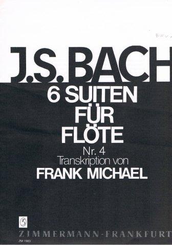 FlautoAutore:Bach Johann Sebastian(1685-1750) Titolo:Suite Es-Dur N.4 BWV.1010Serie:6 Suiten fur flote N.4 Pagine:10 Pag.Transkription von FRANK MICHAEL Originale per violoncello soloEditore:Zimmermann